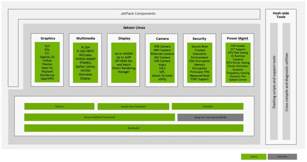 At the core of the stack lies the BSP, which includes the kernel, bootloader, sample root filesystem, toolchain, and sources, enabling full customization and low-level development. Atop the BSP lies critical software blocks across domains such as graphics (like Vulkan, OpenGL, and Wayland), multimedia (like NVCodec and FFMPEG), display (supporting HDMI, DP, and direct rendering), camera frameworks (like V4L2 and Argus), security features (like secure boot, TPM, and encryption),and power management (like SC7, rail gating, and dynamic scaling). These modules ensure robust support for high-performance, power-efficient embedded AI applications.