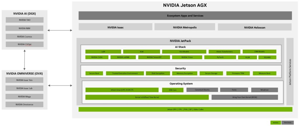 At its core, Jetson software includes the latest JetPack SDK. JetPack is built on a modern foundation with a redesigned compute stack featuring Linux kernel 6.8 and Jetson Linux, which is derived from Ubuntu 24.04 LTS. It introduces several critical technical advancements: The Holoscan Sensor Bridge enables flexible, high-throughput sensor data integration; Multi-Instance GPU (MIG) support brings resource partitioning to Jetson, allowing concurrent and isolated workloads; and the inclusion of a PREEMPT_RT kernel unlocks true deterministic performance for mission-critical, real-time use cases. JetPack also includes support for Jetson Platform Services (JPS) and is architected for the next-generation platform—Jetson Thor.
